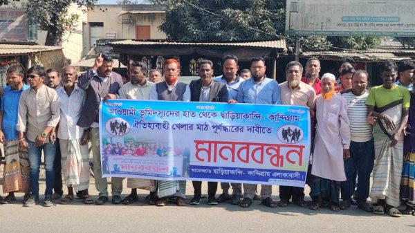 মুহাম্মদ কাইসার হামিদ,কুলিয়ারচর কিশোরগঞ্জ। কিশোরগঞ্জের কুলিয়ারচরে ভূমিদস্যুদের হাত থেকে দ্বাড়িয়াকান্দি-কান্দিগ্রামস্থ ৬৫ বছরের ঐতিহ্যবাহী খেলার মাঠ পুনরুদ্ধারের দাবীতে ফের মানববন্ধন ও বিক্ষোভ মিছিল করেছে এলাকাবাসী। ১২ জানুয়ারি রোববার দুপুরে কুলিয়ারচরস্থ দ্বাড়িয়াকান্দি