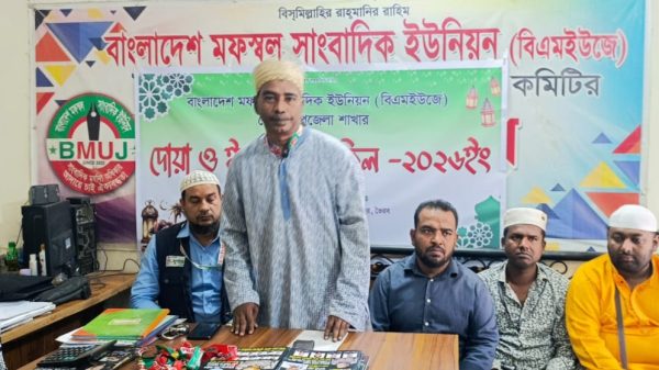 ভৈরব কিশোরগঞ্জ প্রতিনিধিঃঃ কিশোরগঞ্জের ভৈরব পৌর শহরের কমলপুর লোকাল বাসস্ট্যান্ড এলাকায় অবস্থিত বাংলাদেশ মফস্বল সাংবাদিক ইউনিয়ন (বিএমইউজে) ভৈরব উপজেলা শাখার কার্যালয়ে সোমবার (৯ মার্চ ২০২৬) এক আন্তরিক ও ধর্মীয় ভাবগাম্ভীর্যের