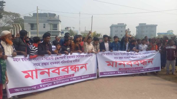 বিজয়নগরে সরকারি খাল উদ্ধার ও রাস্তা নির্মাণের দাবিতে হাজারো মানুষের মানববন্ধন ও বিক্ষোভ ব্রাহ্মণবাড়িয়া জেলা প্রতিনিধি বিজয়নগর উপজেলার ইছাপুরা ইউনিয়নের ফুলবাড়িয়া থেকে খাদুরাইল গ্রামের মধ্যে বিলুপ্ত খাল পুনঃখনন ও রাস্তা