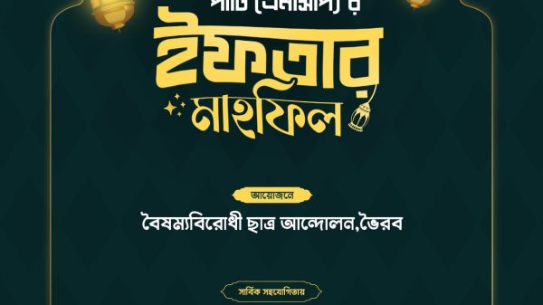 কিশোরগঞ্জ ভৈরবে জুলাই অভ্যুত্থানে আহত ও শহীদপরিবারের সদস্যদের সাথে নিয়ে শুক্রবার(২১মার্চ) বিকালে জাতীয় নাগরিকপার্টি(এনসিপি)এর উদ্যোগে,ভৈরব নিউ টাউন ভেনিস বাংলা কমিউনিটি সেন্টার,বৈষম্য বিরোধী ছাত্র আন্দোলনের সভাপতিত্বেওসঞ্চালনায় আলোচনা,ইফতারওদোয়া মাহফিল অনুষ্ঠিত। হয়েছে শুরুতেইপবিত্র