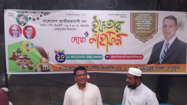 ভৈরব প্রতিনিধঃ মঙ্গলবার চন্ডিবের হাজী আসমত আলী ঈদগাহ মাঠে,বাংলাদেশ জাতীয়বাদী দল ভৈরব পৌর বিএনপি ৯ও১০ নং ওয়ার্ডের,নেতৃবৃন্দের উদ্যোগে ইফতার ও দোয়া মাহফিল এর আয়োজন করা হয়। উক্ত ইফতার ও দোয়া